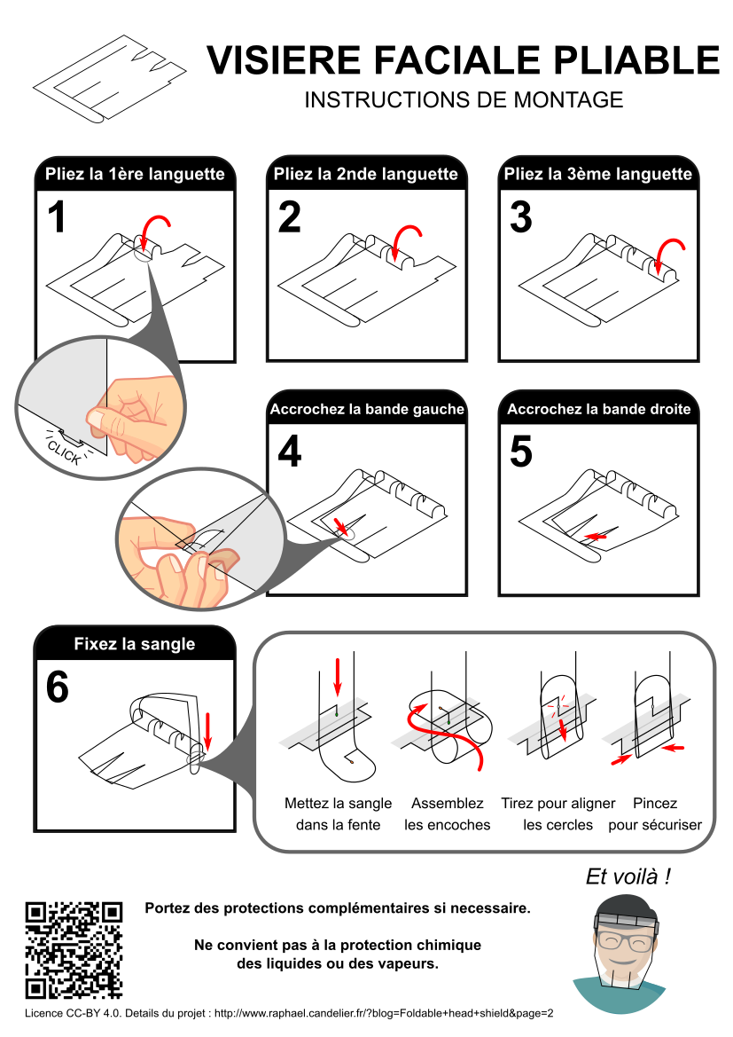 Ce projet porte sur la production de visières pliables pour la protection du visage à destination de toute personne pouvant être au contact de malades. Les visières sont constituées d’une feuille de plastique transparente prédécoupée d’un seul tenant et sont mises en forme par l’utilisateur final via un pliage simple.