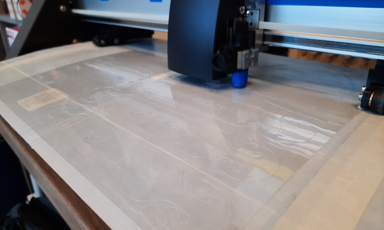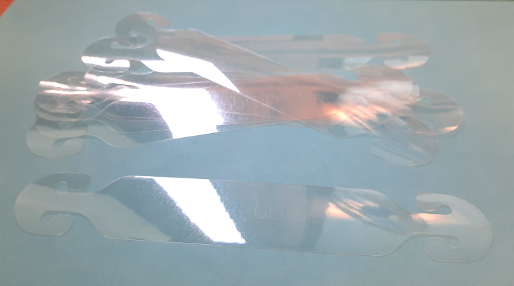 En m'inspirant d'initatives de fabrication de systèmes de maintien comme celle-ci, j'ai développé un modèle qui peut se découper en utilisant la même technologie que les visières de protection pliables, à savoir la découpe de films de PET de 110µm d'épaisseur avec une machine de découpe vinyle (Graphtec CE-6000-40) suivi d'une décontamination.